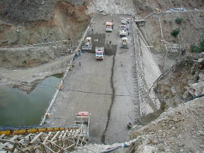 El transporte de la mezcla desde la planta de hormigón al cuerpo de la presa fue realizada por volquetas. Luego la mezcla fue bajada al cuerpo mediante un vacuum chute, una canaleta tapada por una goma que evita la segregación de la mezcla. Recibida por un volquete encima del cuerpo de la presa se extrae mediante tractores D4 y finalmente se compacta con rodillos vibratorios. |