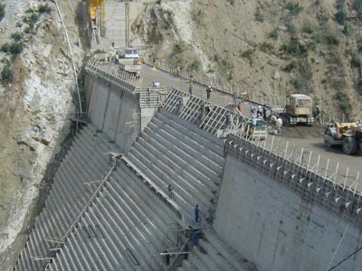 Una caracteristica muy visible y típica para presas de hormigón RCC es la formación de escalones en el talud aguas abajo de la presa. Estos escalones se deben al sistema de encofrado empleado en la construcción. Sin embargo, en la sección del aliviadero de crecidas, los escalones ayudan en la disipación de la energía de flujo a lo largo de la bajada. Es otra ventaja común de presas de RCC, pués la dimensiones de las estructuras de disipación de energía de flujo son reducidas en comparación con secciones lisas de presas por ejemplo. |